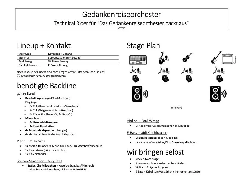 Hier finden Sie den Technischen Rider vom Gedankenreiseorchester. Er beinhaltet, was wir an Technik bei einem Konzert brauchen.